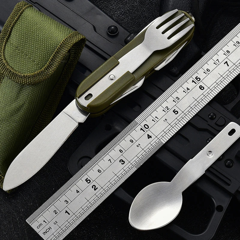 1. foldable multifunctional outdoor cutlery, including knife, fork, spoon and beer bottle opener and other complete sets of equipment.