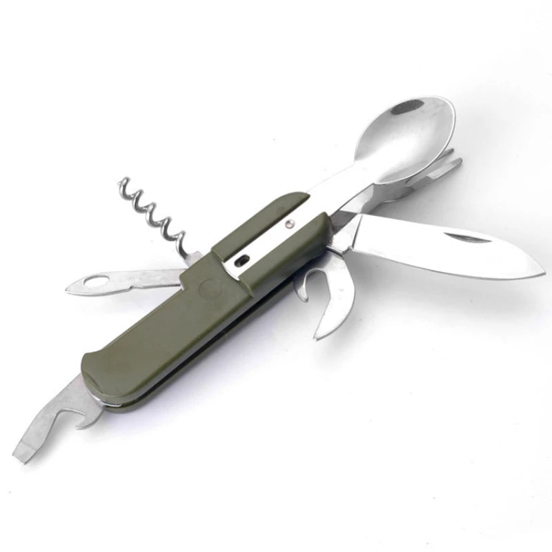 Compact and versatile, this 7-in-1 stainless steel utensil is a must-have for outdoor enthusiasts. Combining a spoon, fork, knife, bottle opener, corkscrew, and more in one portable tool, it’s perfect for camping, hiking, picnics, and emergency kits. Durable, easy to carry, and designed for convenience wherever your adventure takes you.