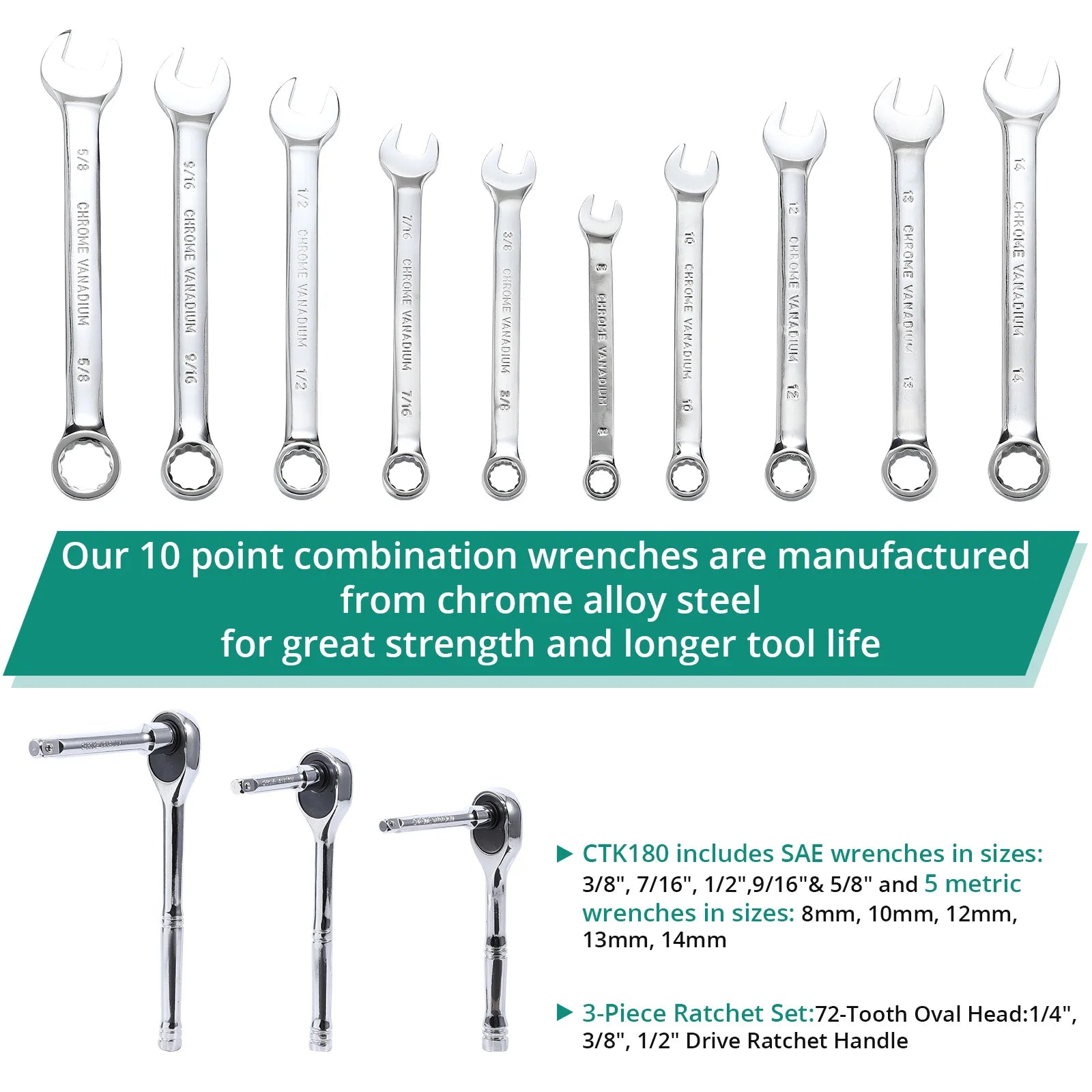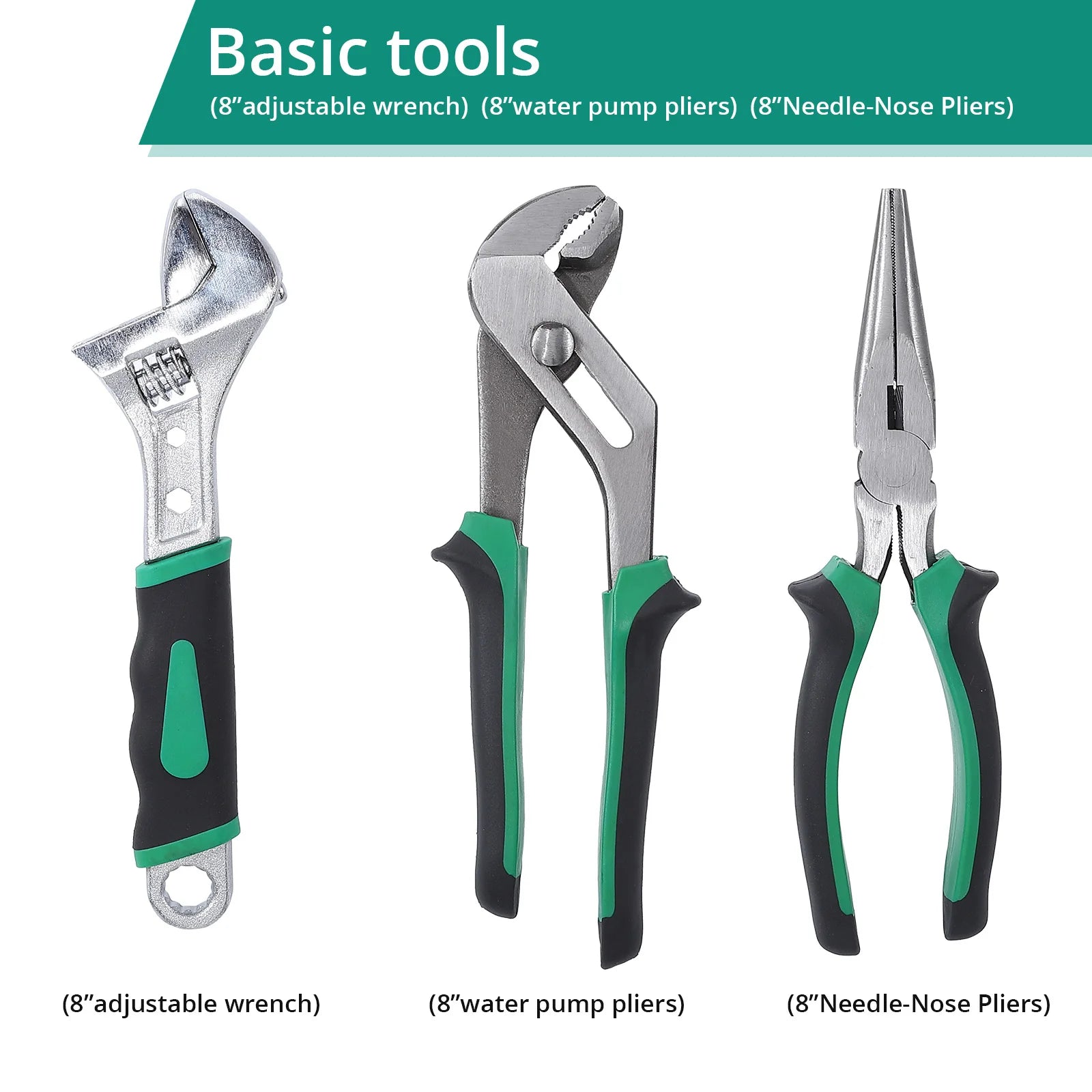 2.Extensive Tool Selection: The 213Pcs tool kit contains mixed sizes Of sae and metric combination wrenches, A complete range of 1/4, 3/8", 1/2" metric and sae sized sockets and 1/2" & 3/8" driver ratchets, Adjustable wrench, pump plier, long nose plier etc. Variety of 1/4-inch screwdriver bits: Phillips, slotted, square, star.