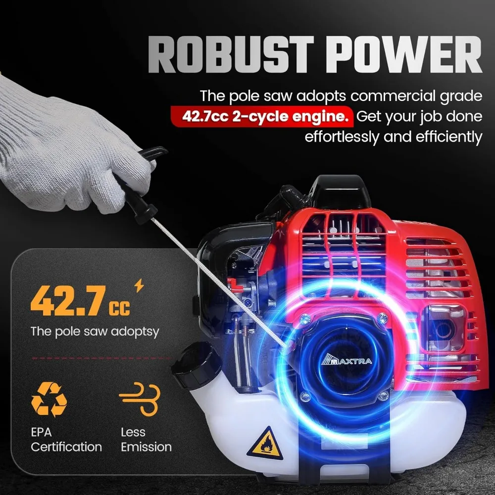 - [Powerful 42.7cc, 1100W, 2-stroke Engine] - provides more power. Branches about 8-10 inches can be cut like butter. Get your job done faster. EPA certified engines consume less fuel than those have no EPA certificates.