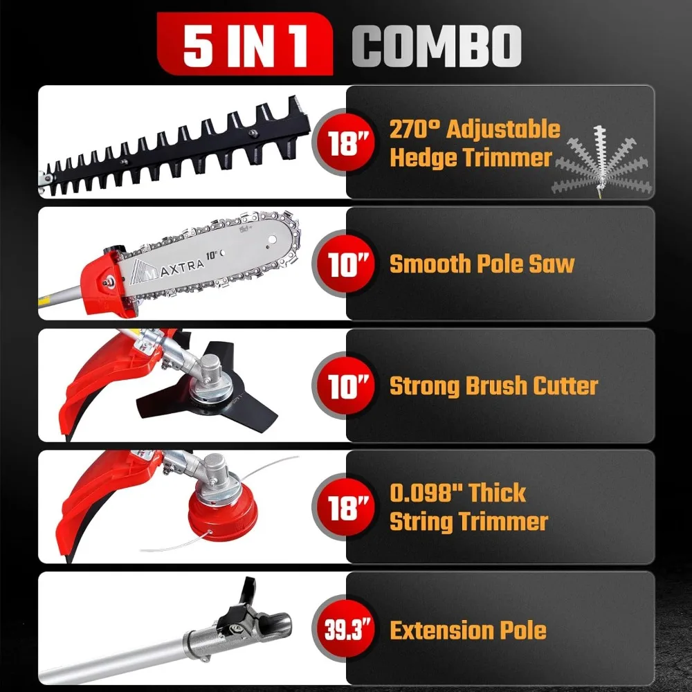 - [5 In 1 Trimming Kits Pack] - Convert it to 4 trimming tools with a Quick-Release button at a time (gas pole saw, hedge trimmer, weed eater, brush cutter, extension pole) for tree trimming, brush cutting, and weeding.