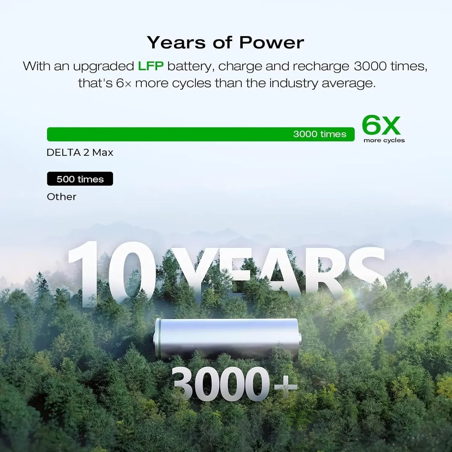 Power through any adventure or outage with the DELTA 2 Max Portable Power Station, delivering a massive 2400W output and equipped with ultra-safe LFP (LiFePO4) battery technology. Recharge from 0–100% in just 1 hour with ultra-fast charging or via solar for off-grid flexibility. Ideal for camping, home backup, RVs, or remote job sites, it’s built for reliability, longevity, and high-performance energy on demand.
