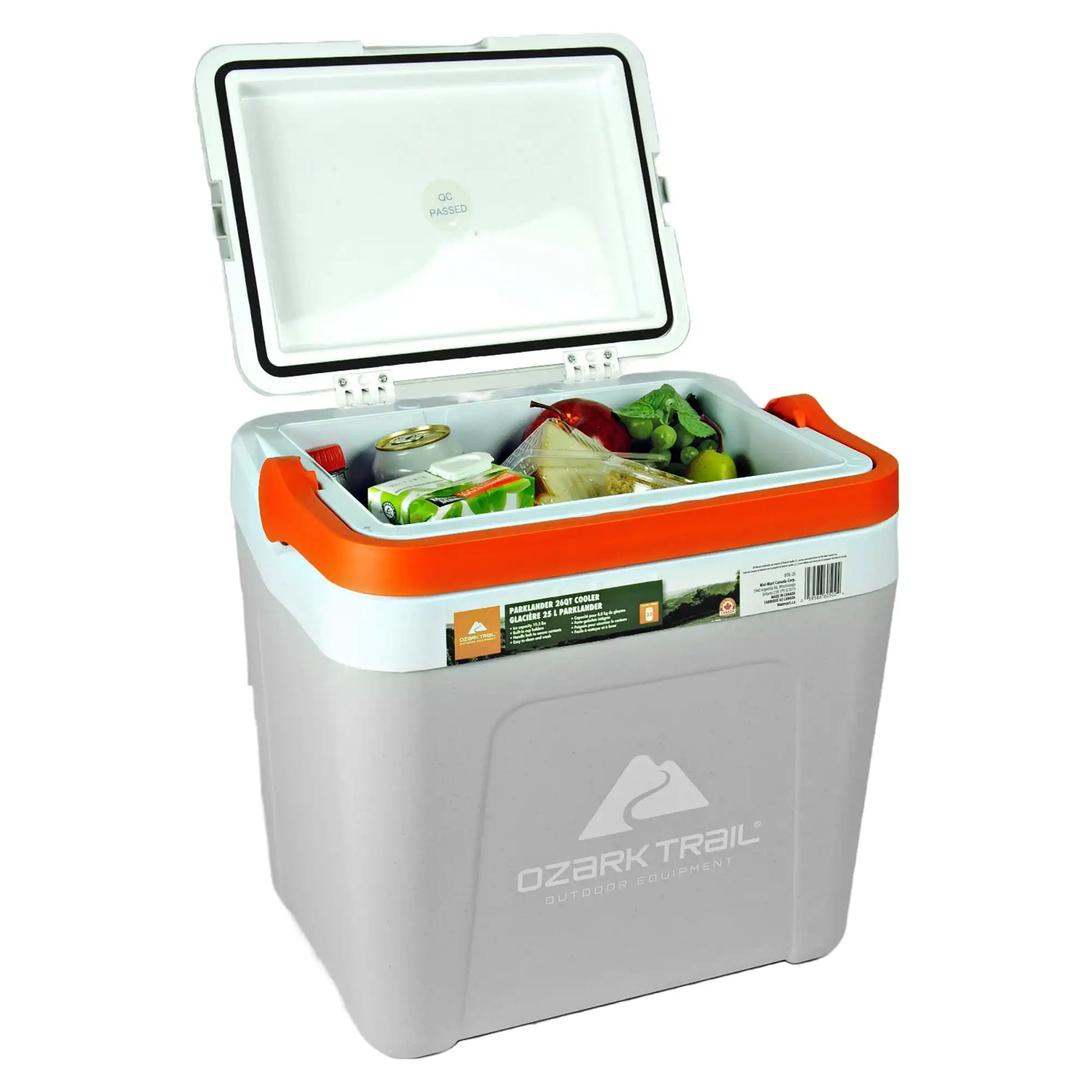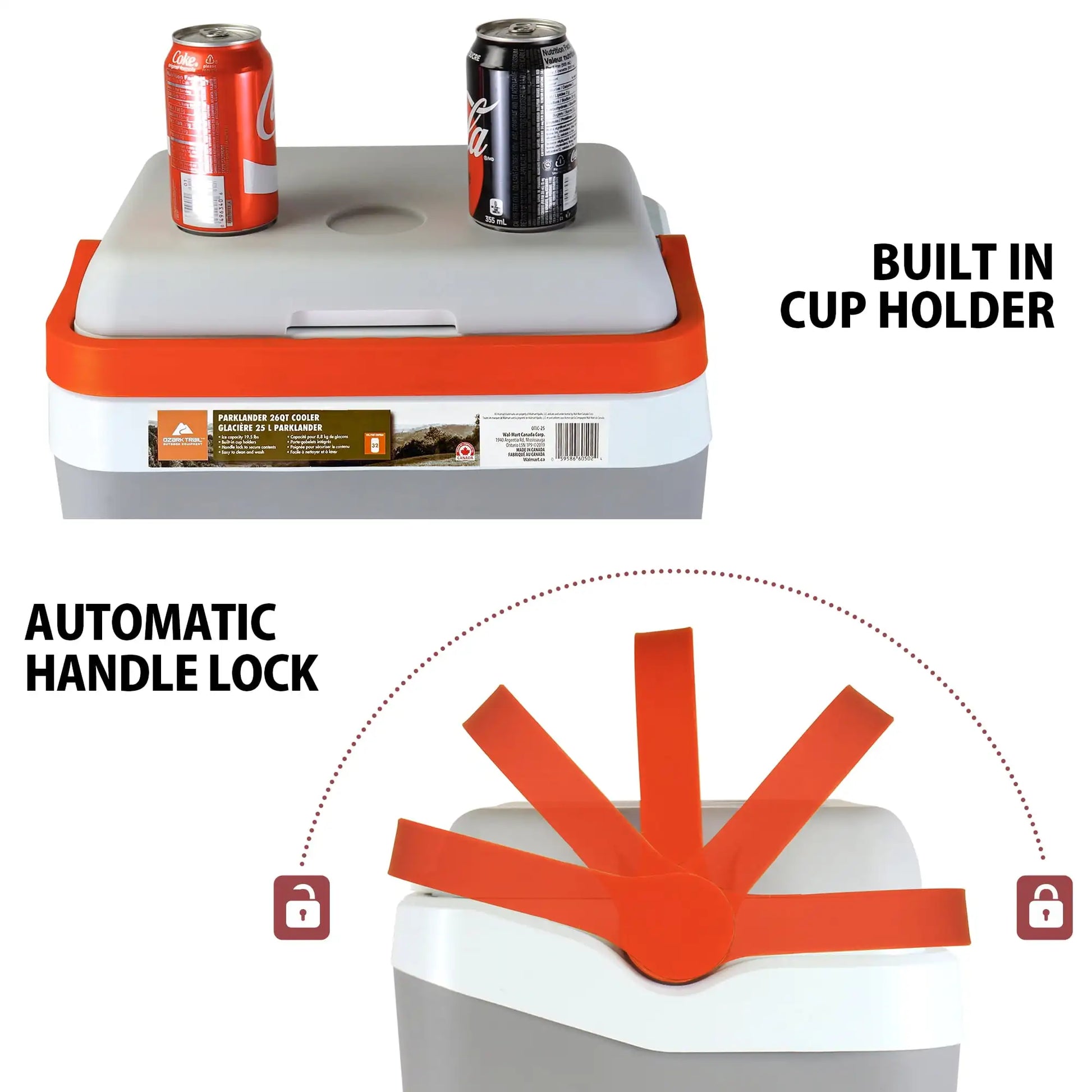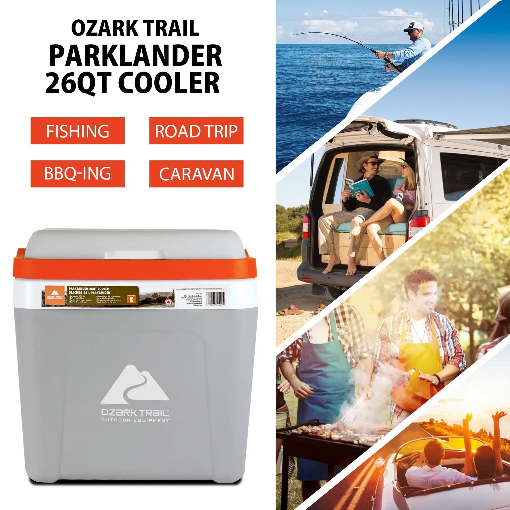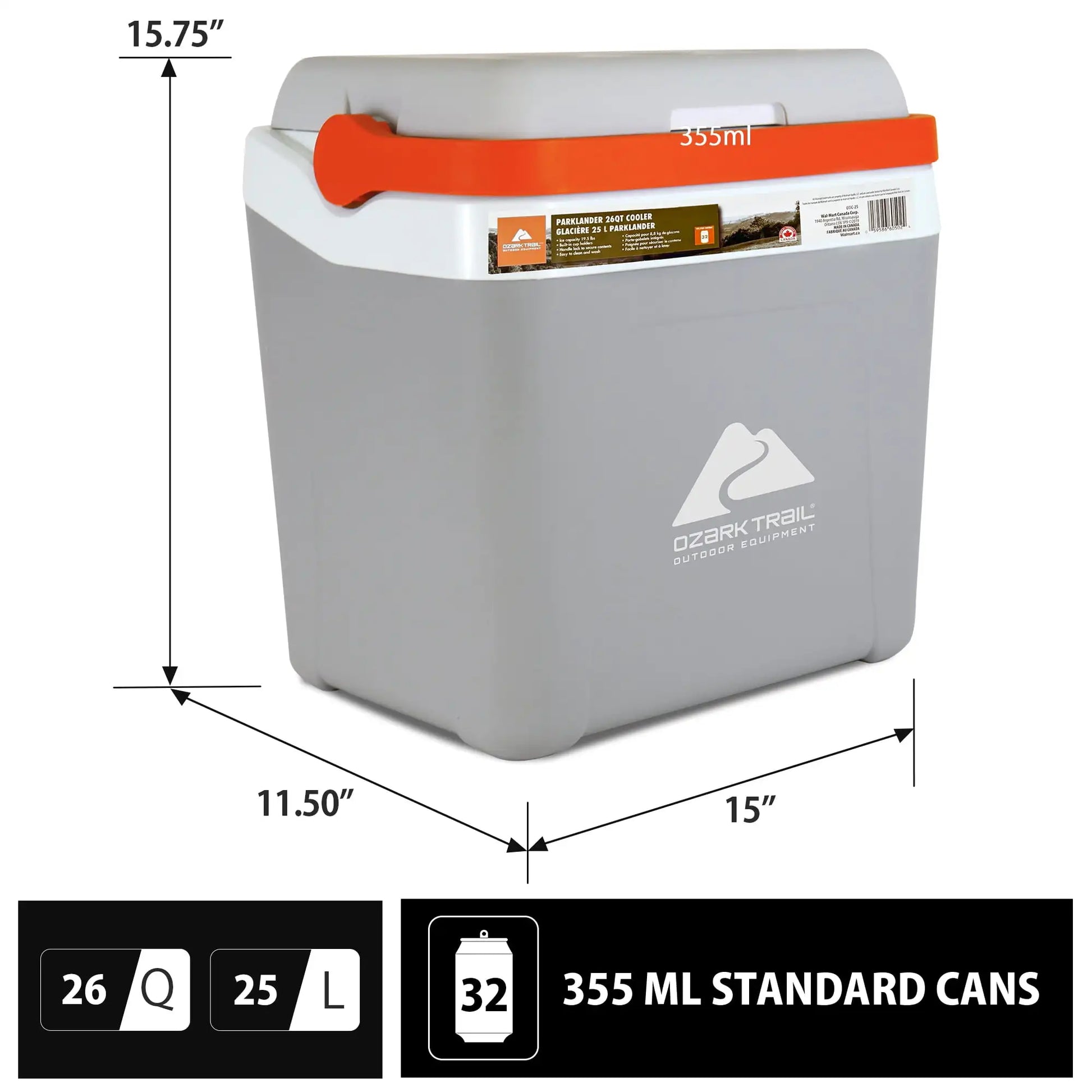 - 25L (26QT) Hard Sided Portable Ice Chest Cooler, Grey and Orange. Packing for day trips or lunch at work is easy With its 26 QT capacity and compact footprint, Β is the perfect cooler for day-trippers, picnickers, festivalgoers, or even just a day at the office. Designed for portability, it features a durable handle that locks into place to secure the lid and a convenient divider to organize contents. Advanced insulation and an air-tight seal trap cold air inside for maximum efficiency, so you can keep your favourite drinks cold or safely transport perishable items like yogurt, cheese, milk, and meats. Versatile, eco-friendly convenience you can trust keeping ice cooler frozen for up to four days. All you must do is fill it up with ice and pre-chilled drinks and snacks and you're ready to hit the road.