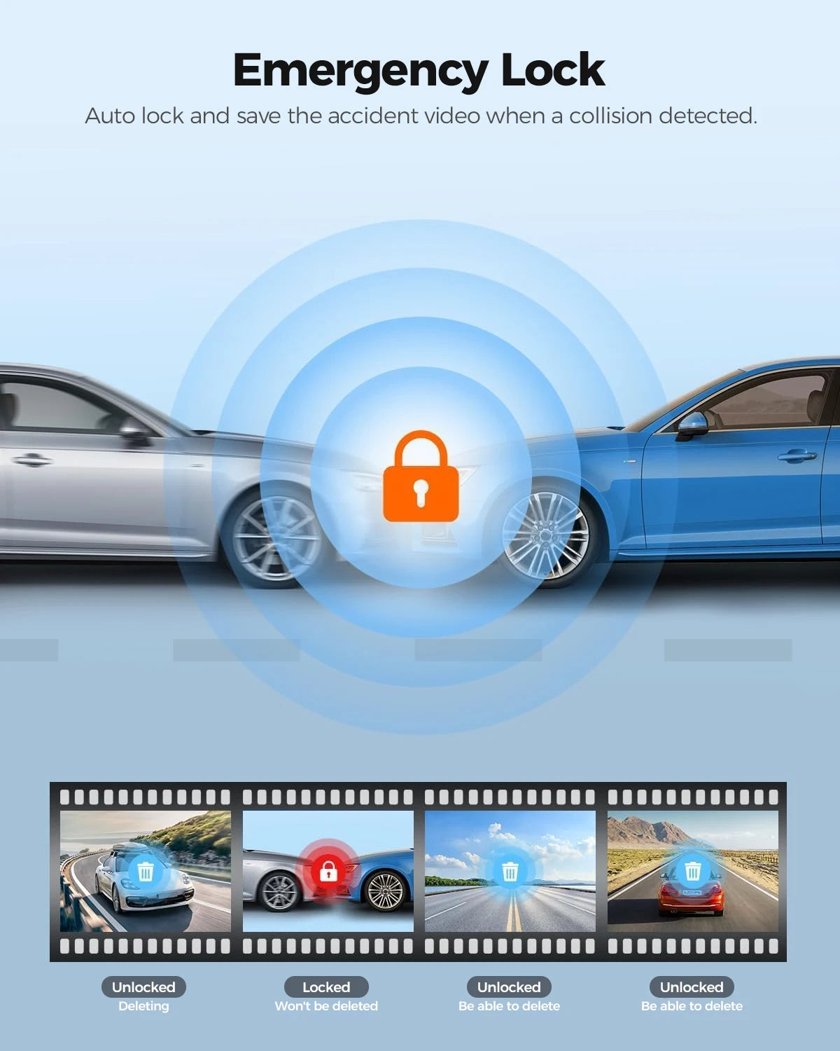 Whether the car is driving or parking, when the G-sensor receives a sudden impact or collision signal, the dash cam will automatically shoot, save and lock the video. The loop recording will skip the emergency locking video. All important videos will remain in memory unless you delete them manually.