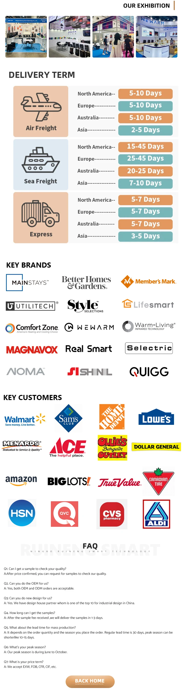 • Four infrared quartz elements • Overheat safety shutoff • Cool touch exterior cabinet • 9 hour programmable timer • Extra large LED display • Thermostat control system • Remote control with LED indicator (2-AAA batteries not included) • One year limited warranty • No assembly required |