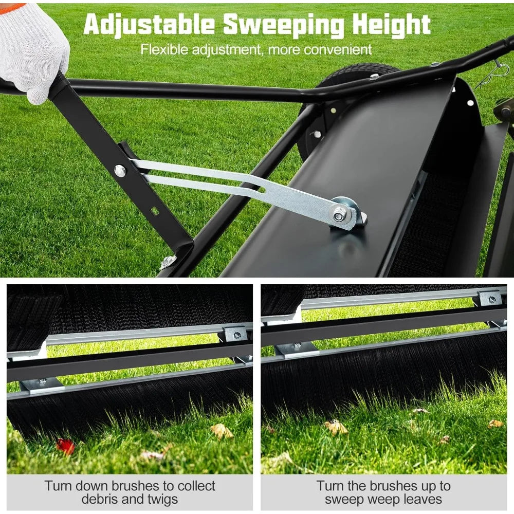- 【42" Cleaning Width & Adjustable Sweeping Height】This tow-behind lawn sweeper is equipped with 4 heavy-duty nylon brushes, with a sweeping width of 42", offering efficient cleaning and quick leaf collection. Moreover, the sweeping height is effortless to adjust, making it ideal to collect different debris types.