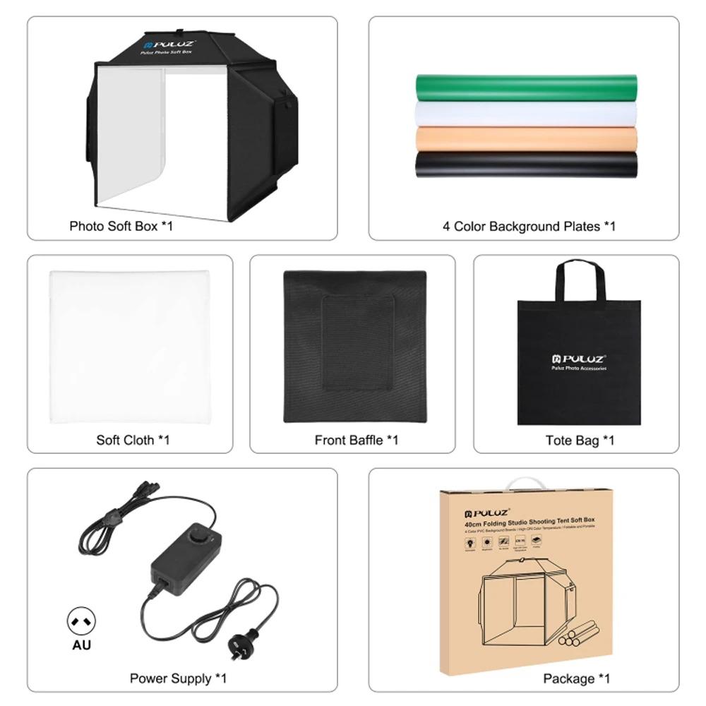 Capture sharp, shadow-free photos with this 40cm foldable photo studio tent. Equipped with 72W 5500K daylight LEDs and 4 interchangeable colored backdrops, it’s perfect for shooting products, jewelry, and small items with professional clarity. Compact, portable, and easy to set up—ideal for eCommerce, content creators, and photographers on the move.