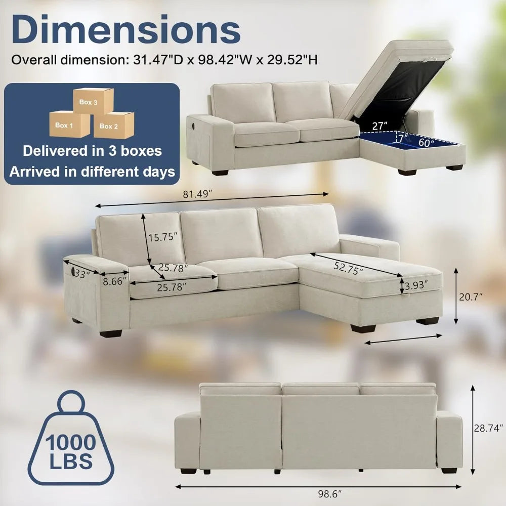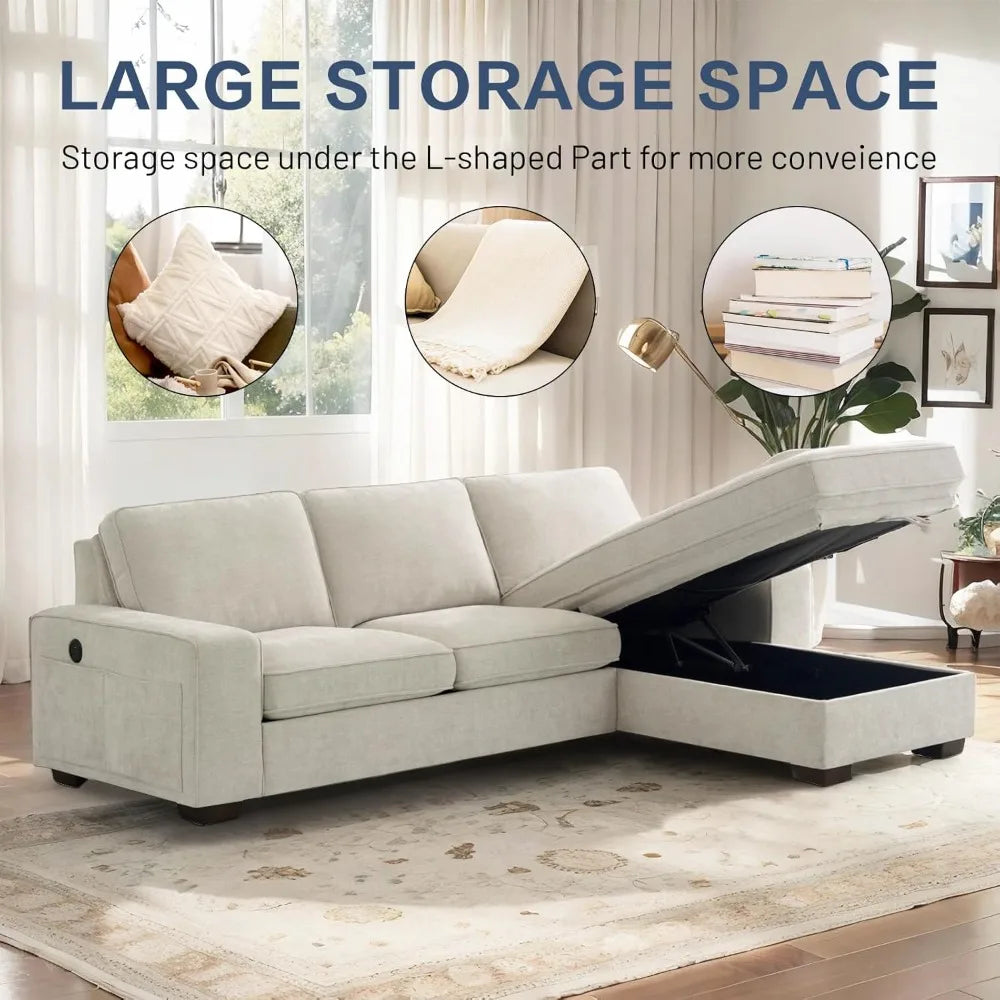 - 【 HUGE STORAGE SPACE UNDER CHAISE SEAT】Upgrade your living area with this sectional couch that features extra large storage space under chaise seat measuring 27" × 60" × 6". The hidden storage compartment provides ample room for blankets, pillows, books, and other items, keeping your space neat and tidy. The couch provides also convenient side pockets for small items like remote controls and magazines.