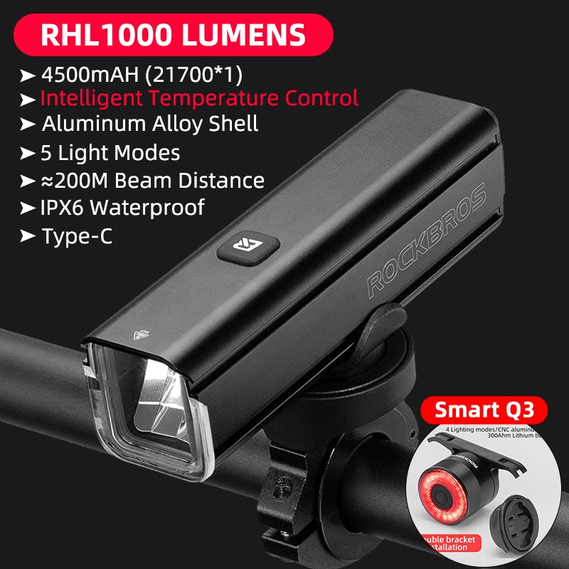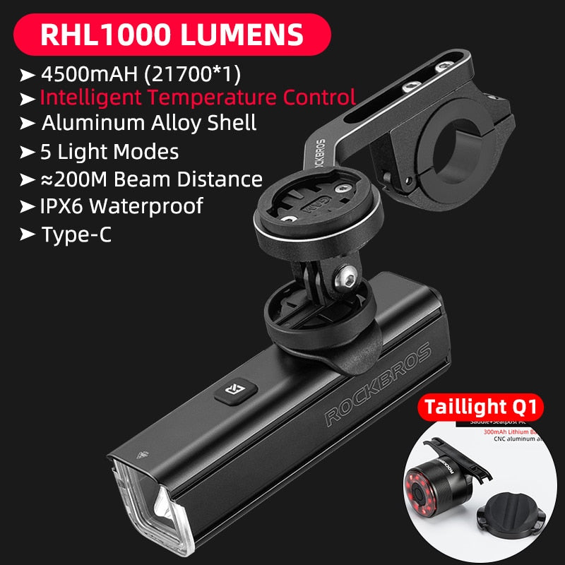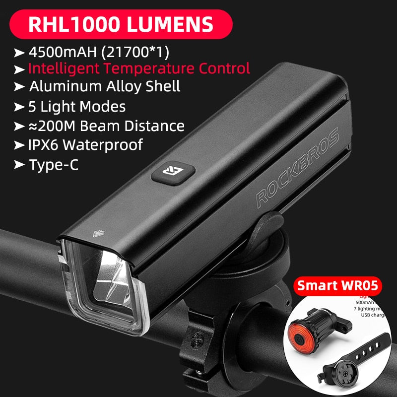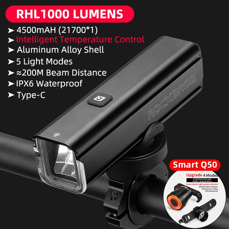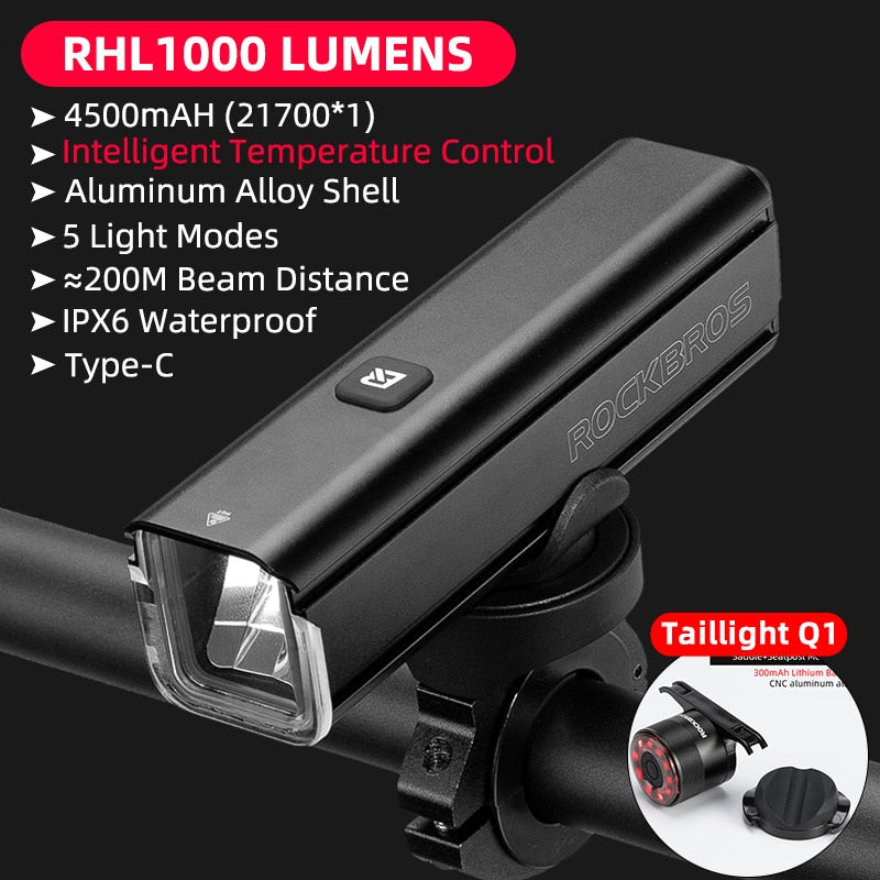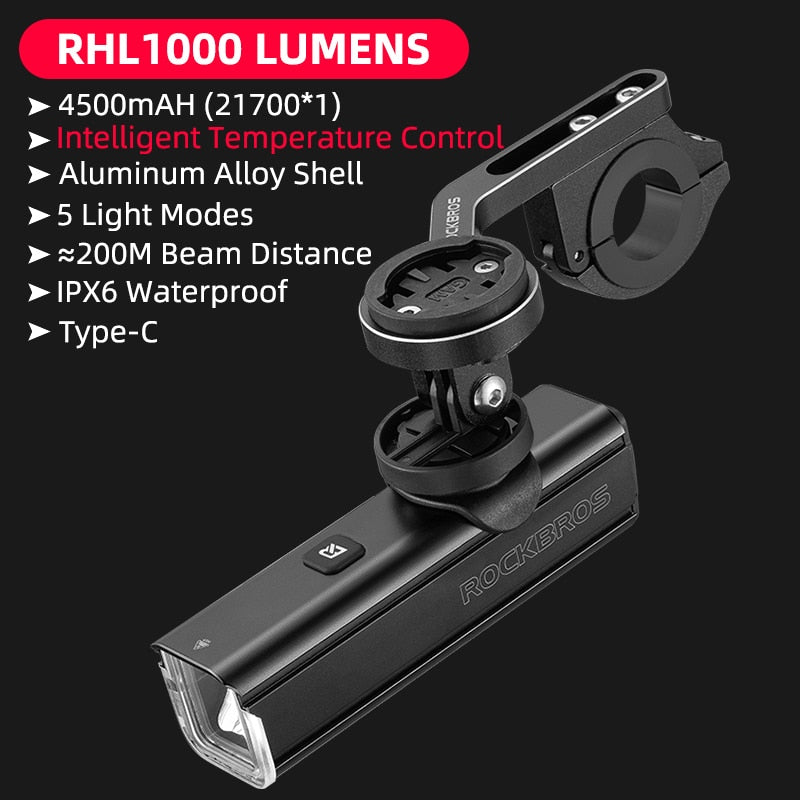 Illuminate Your Ride with ROCKBROS 1000LM Type-C Rechargeable Bicycle Front Light – Powerful LED, 4500mAh Battery, Waterproof Design