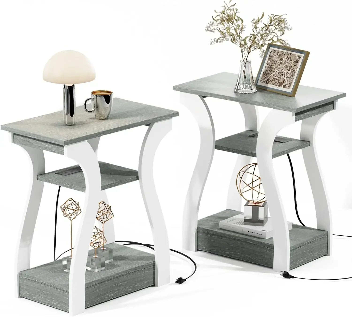 Upgrade your living space with this set of 2 smart side tables, combining style and function. Each table features a built-in charging station with USB ports and AC outlets, making it easy to power phones, tablets, and lamps. The three-tier design offers ample storage for books, remotes, or décor, while the compact footprint fits perfectly in living rooms, bedrooms, or offices.