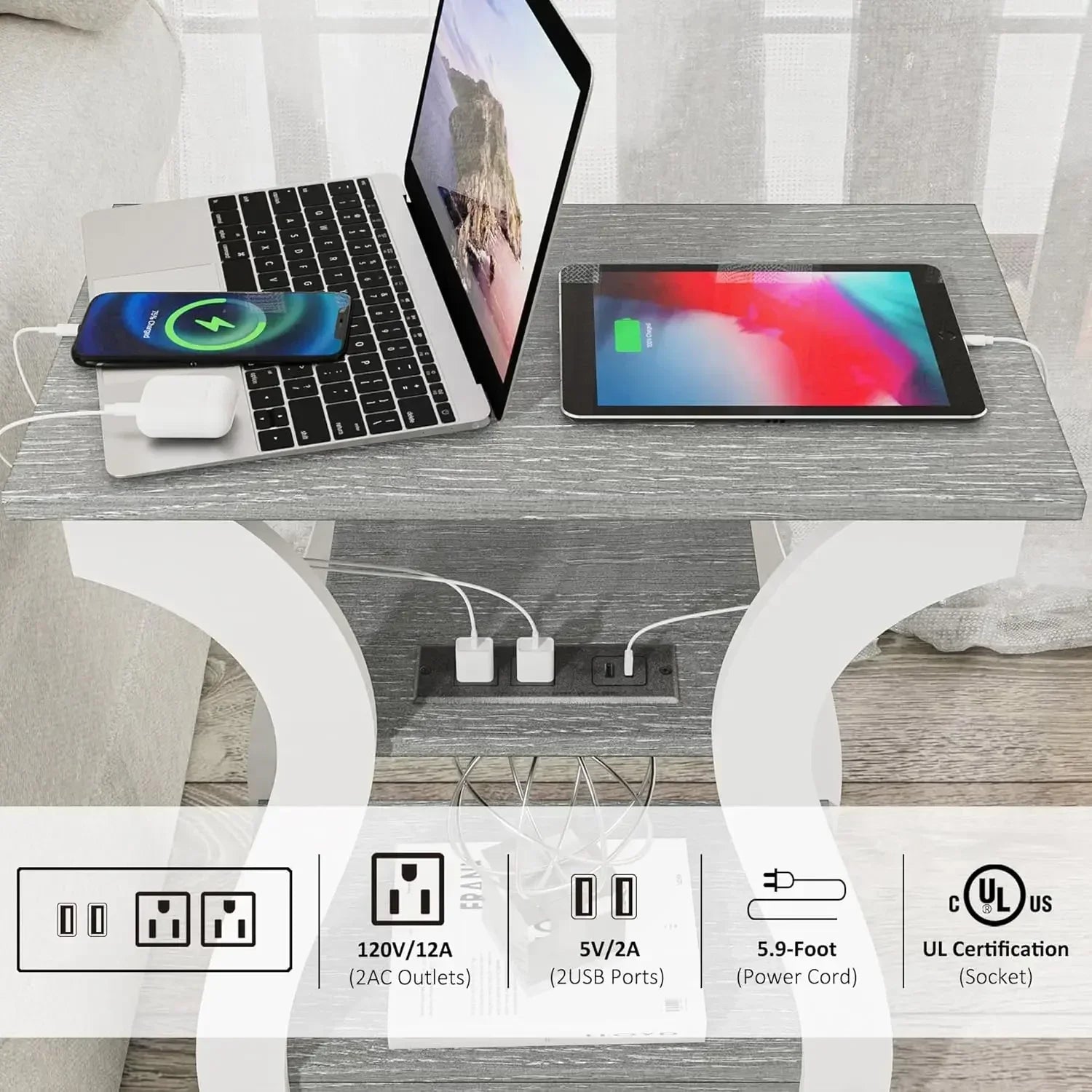 - 【End Table with Charging Station Set of 2】The end table with USB ports and plug outlets is very convenient for you to keep your mobile phone, ipad and Labtop within reach when charging. The charging station includes two sockets, two USB ports and a 5.9-foot long power cord, which ensures it can be charged up to four electronic devices at the same time, providing convenience.