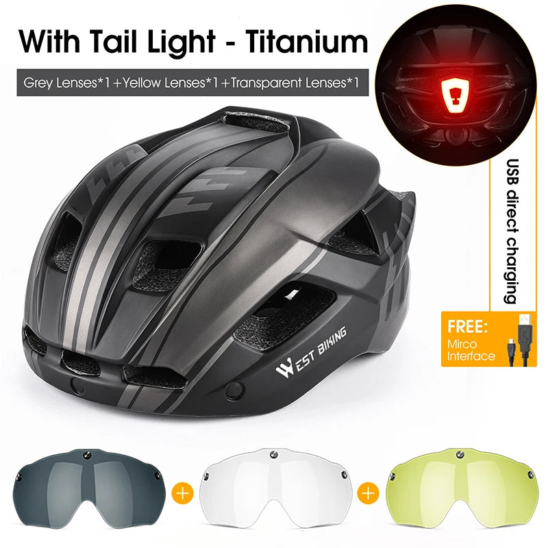 WEST BIKING Unisex Cycling Helmet with Taillight, Goggles, and Sun Visor – Safety Helmet for MTB, Road Bikes, and Motorcycles