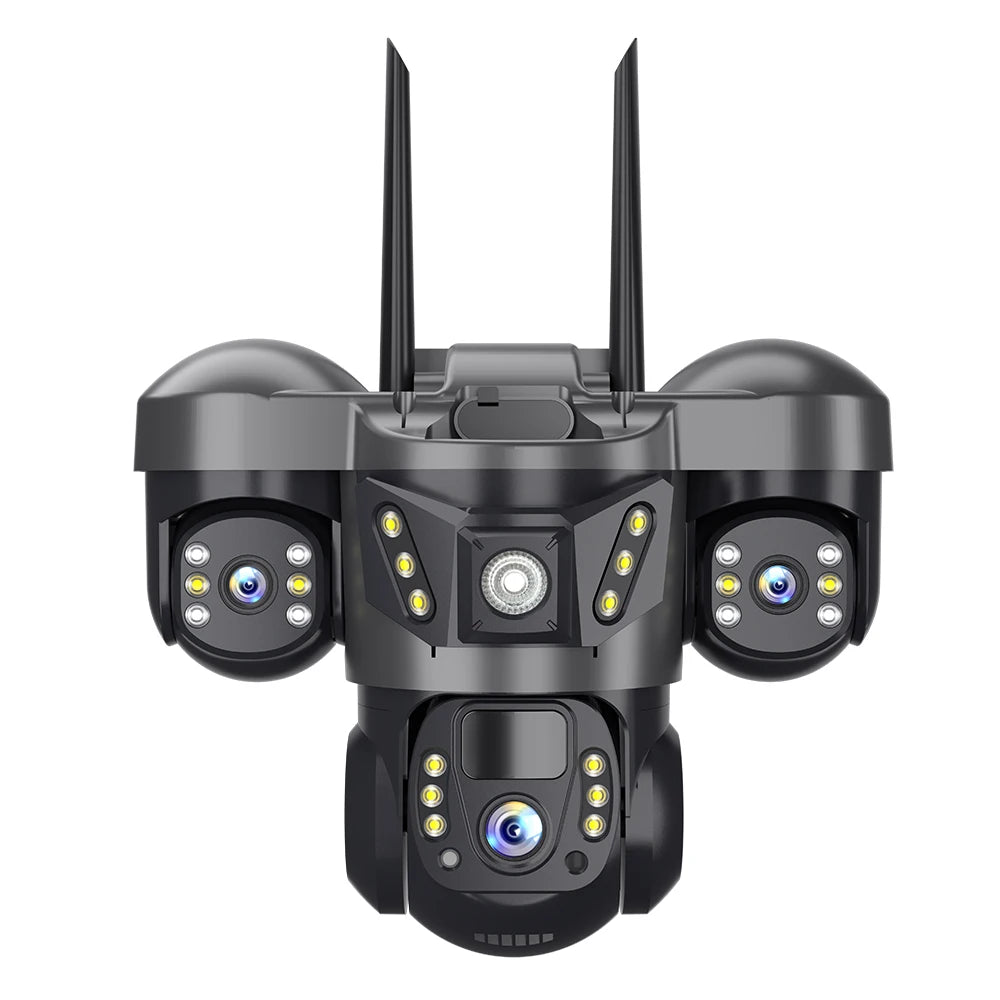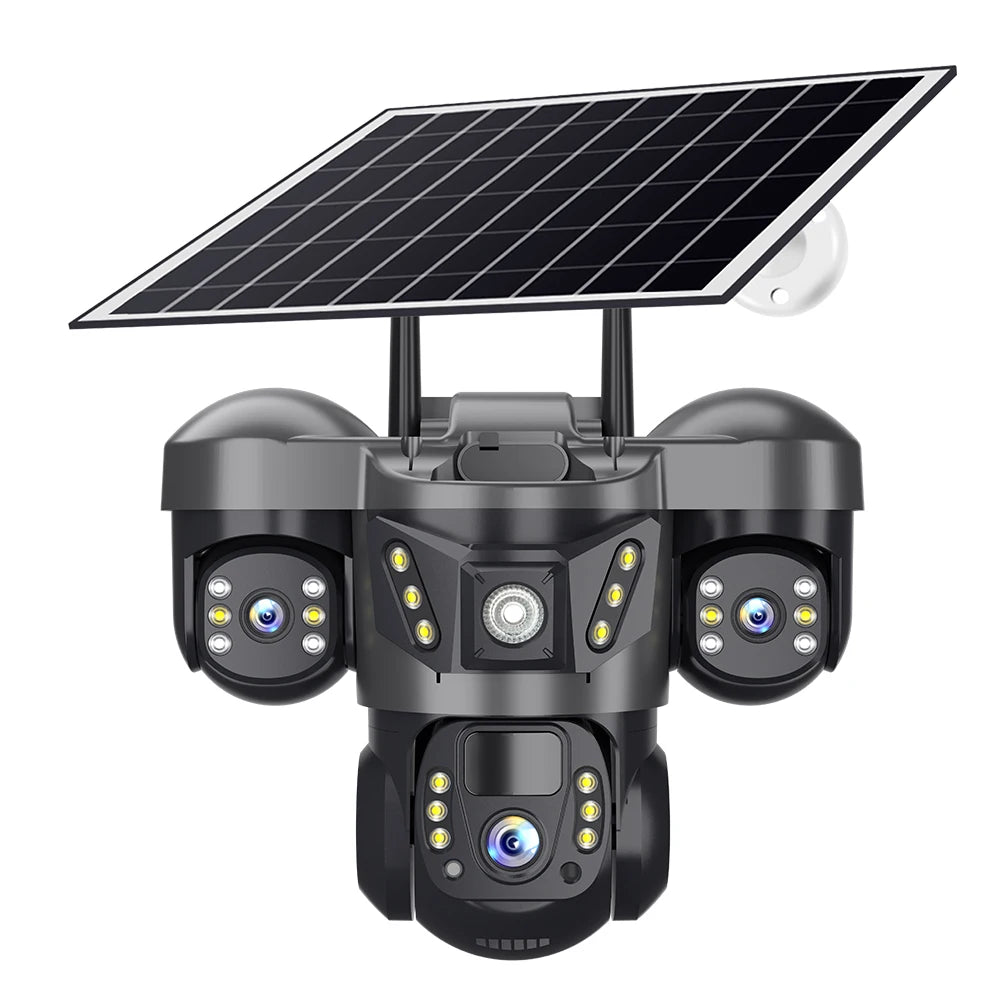 V380 Solar-Powered Surveillance Camera – True-View Three-Screen Multi-Lens Security with No Electricity or WiFi Required