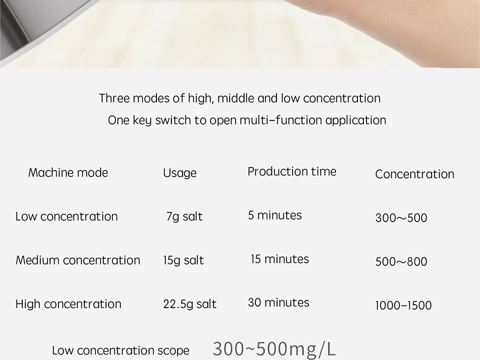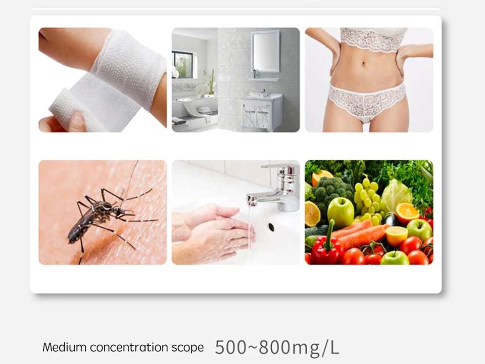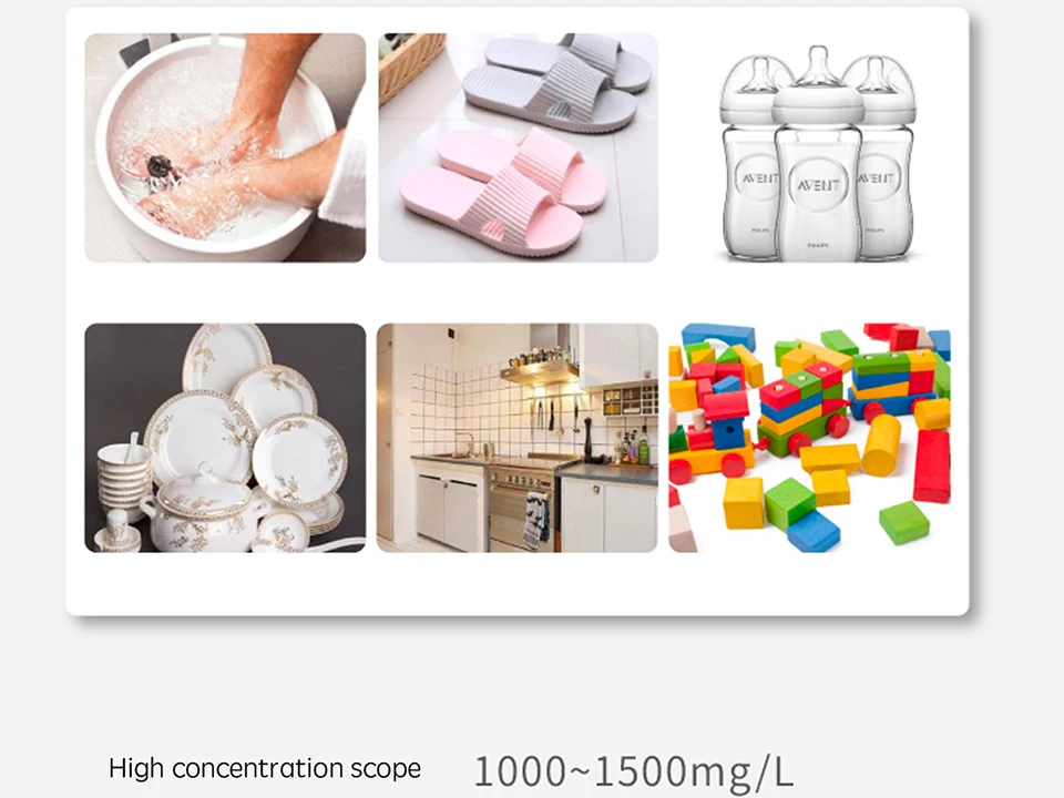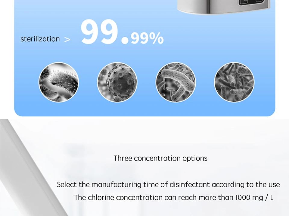 3 Concentration: Three different concentrations of disinfection water can be made, high concentration, medium concentration and low concentration.