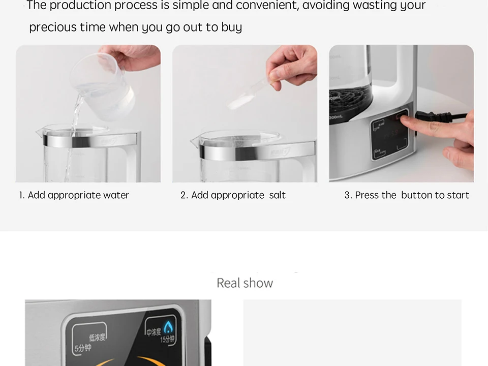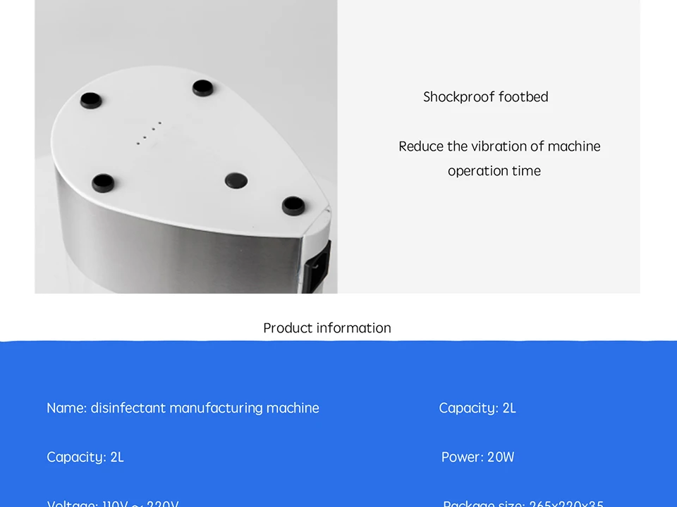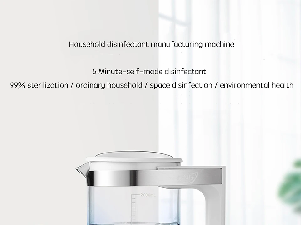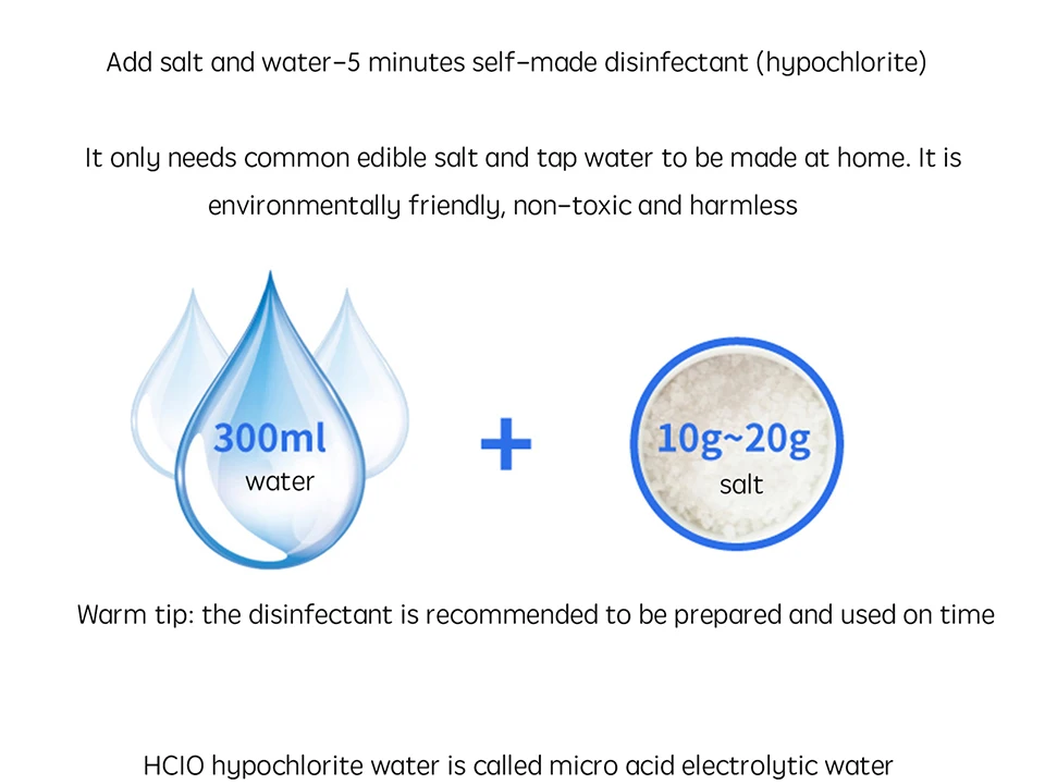 Working principle: edible salt + tap water = disinfectant (electrolytic salt water) Only ordinary salt and tap water are needed to make environmentally friendly, non-toxic, harmless, and chemical.