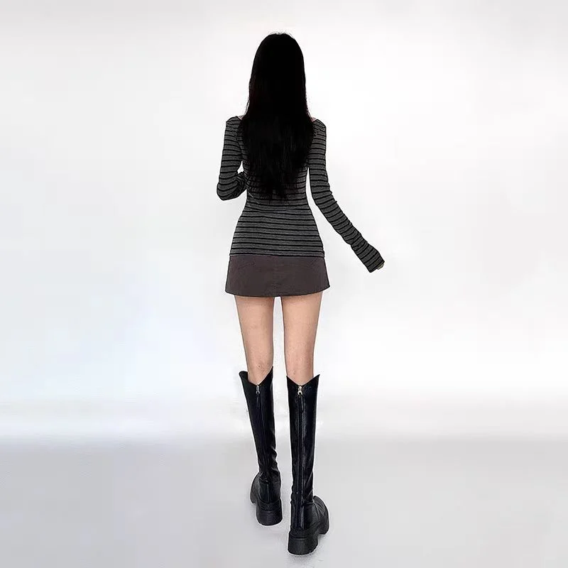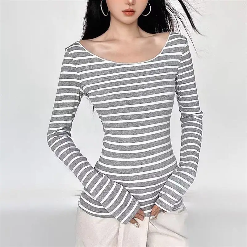 Y2K Grunge Striped Off-Shoulder Long Sleeve Top – Vintage 00s Emo Goth Aesthetic Tee for Women